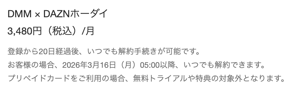 一方で「DMM × DAZNホーダイ」は解約通知期間がないため、解約手続きさえ取っておけば、1ヶ月経過時点で解約が完了します。