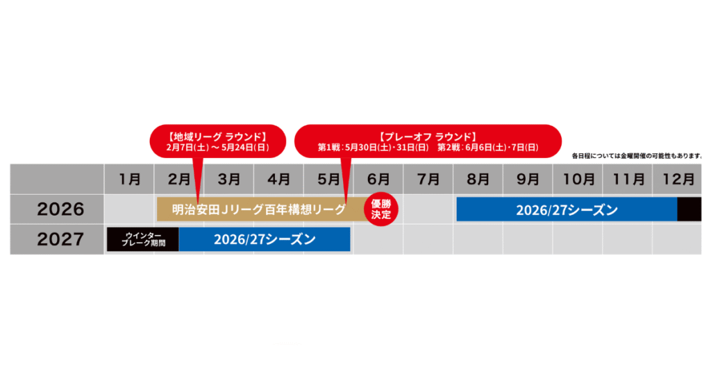 また、2026年からJリーグは秋春制に移行するため、開幕月は8月に変更。12月中旬から翌年2月中旬までの約2ヶ月間は、ウインターブレーク期間として一時休止し、5月に閉幕というスケジュールです。