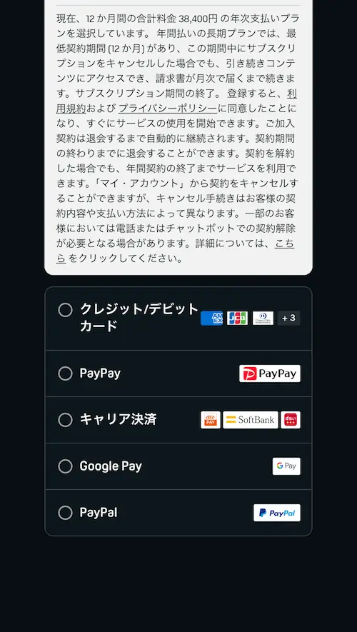 クレジットカード以外の支払い方法は「DMMポイント」、「d払い」、「au PAY(auかんたん決済)」、「ソフトバンク・ワイモバイル まとめて支払い」の4つがあります。