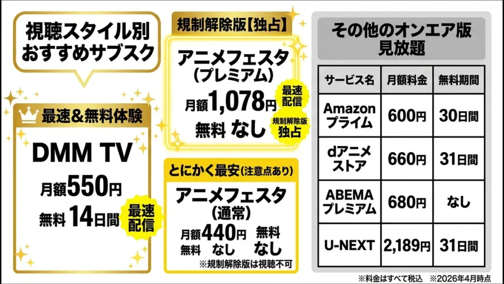 最安のサブスクは『アニメフェスタ』の440円。ただし、規制解除版を視聴する場合は1,078円となります。